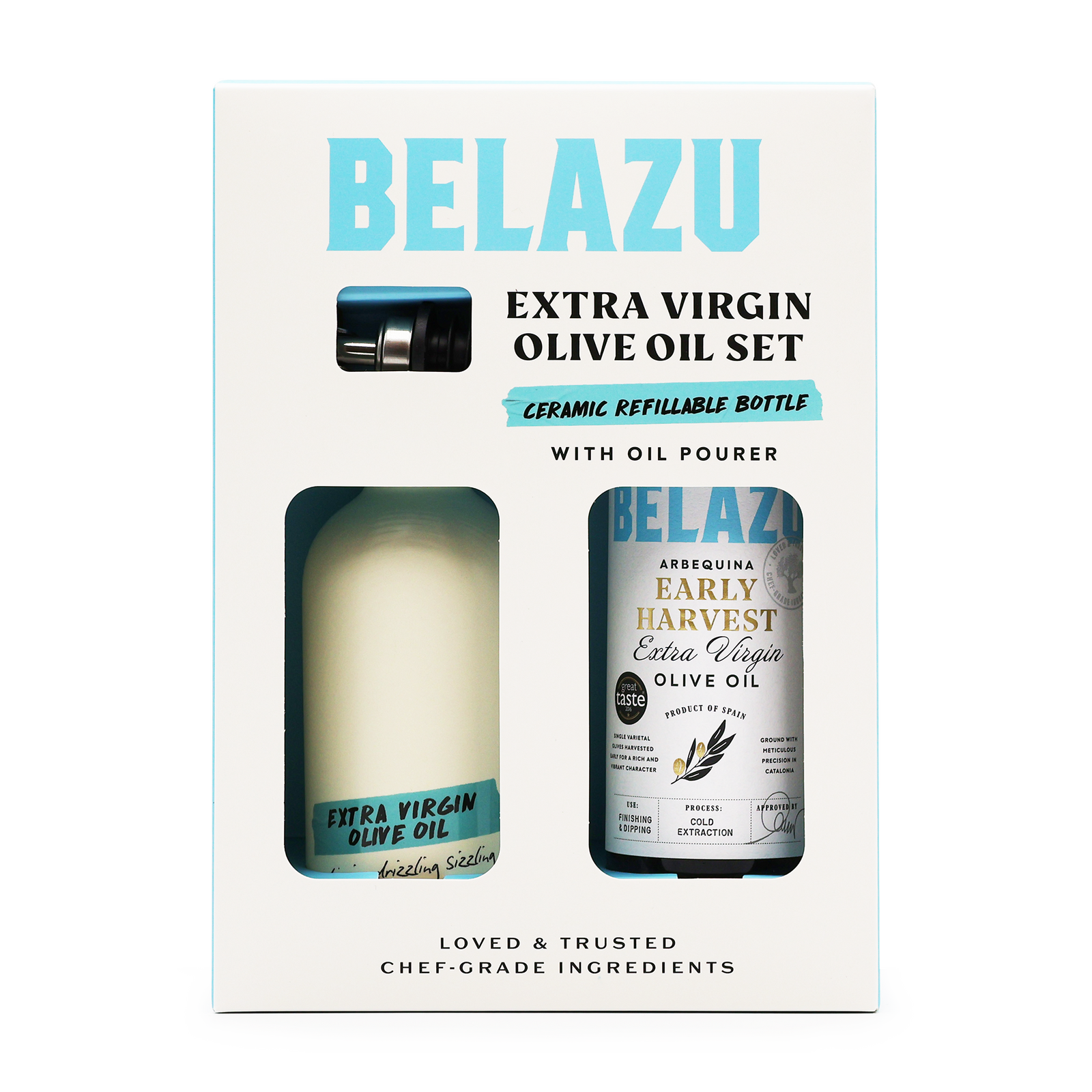 A sophisticated and functional addition to any kitchen or table, this elegant gift set showcases the exceptional quality of Belazu’s Early Harvest Extra Virgin Olive Oil, paired with a beautifully crafted ceramic refillable bottle and stainless steel pourer. Belazu Early Harvest Extra Virgin Olive Oil (500g): Cold-pressed from green Koroneiki olives picked early in the season, this oil is vibrant, grassy, and peppery – ideal for drizzling over salads, grilled vegetables, or fresh bread. Ceramic Refillable Bottle with Oil Pourer: A stylish and practical kitchen essential. The ceramic bottle protects your olive oil from light to maintain its quality, while the sleek pourer allows for controlled, mess-free drizzling. Designed to be refilled and reused, it’s both sustainable and beautiful. Perfect as a gourmet gift or a pantry upgrade for passionate home cooks and entertainers.