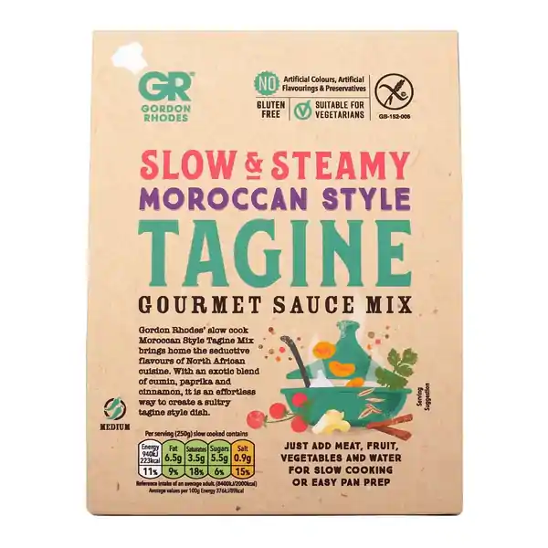 Gordon Rhodes' slow cook Moroccan Style Tagine Mix brings home the seductive flavours of Northern African cuisine. With an exotic blend of cumin, paprika and cinnamon, it is an effortless way to create a sultry tagine style dish.