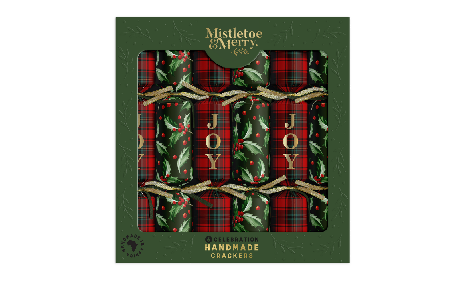 Traditional tartan patterns combined with festive berry accents give these Celebration Crackers a cosy Christmas feel. Handmade in South Africa and filled with quality inclusions, each cracker contains a fun gift, festive joke, paper hat and snap.