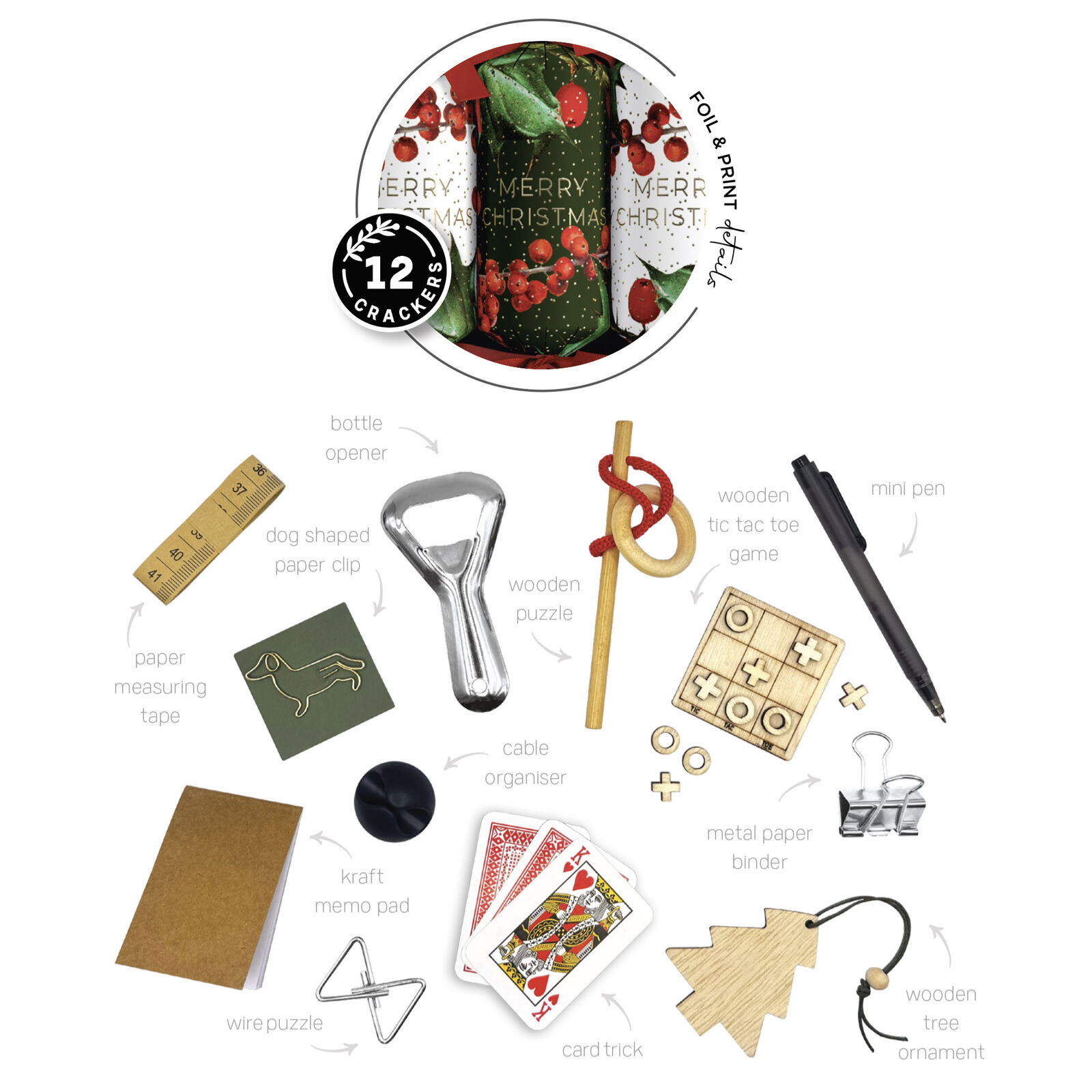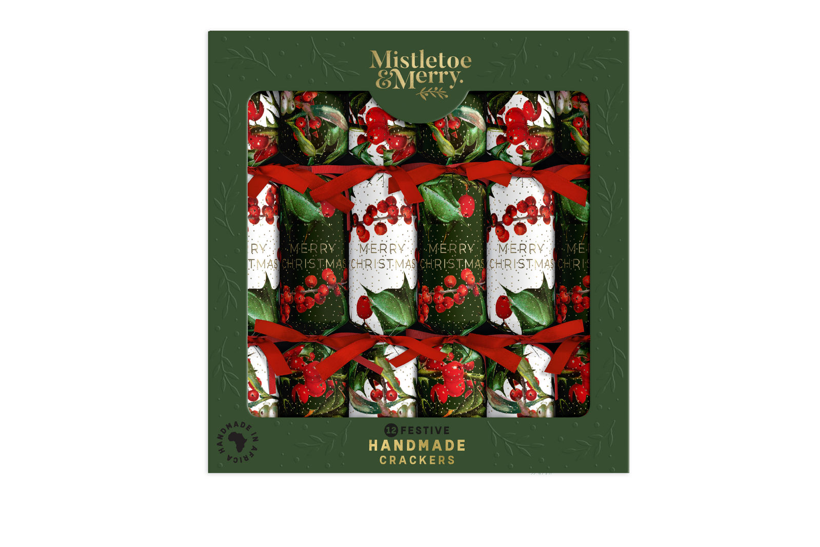 Designed for family celebrations, these Festive 12 Pack Christmas Crackers feature classic holly and berry designs. Handmade in South Africa and filled with quality fun gifts, festive jokes, paper hats and snaps, offering excellent value and festive table decoration.