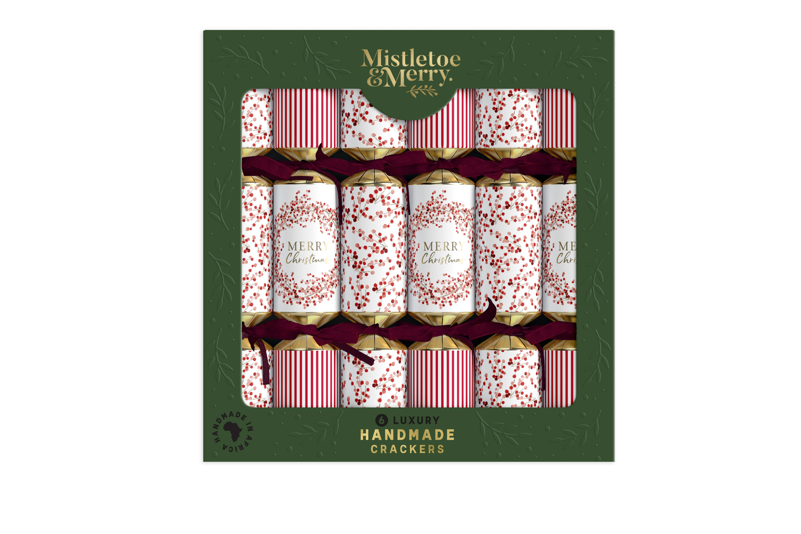 Classic stripes paired with festive berry accents give these Luxury Christmas Crackers timeless appeal. Handmade in South Africa with exceptional craftsmanship, each cracker contains a luxury quality gift, festive joke, paper hat and snap.