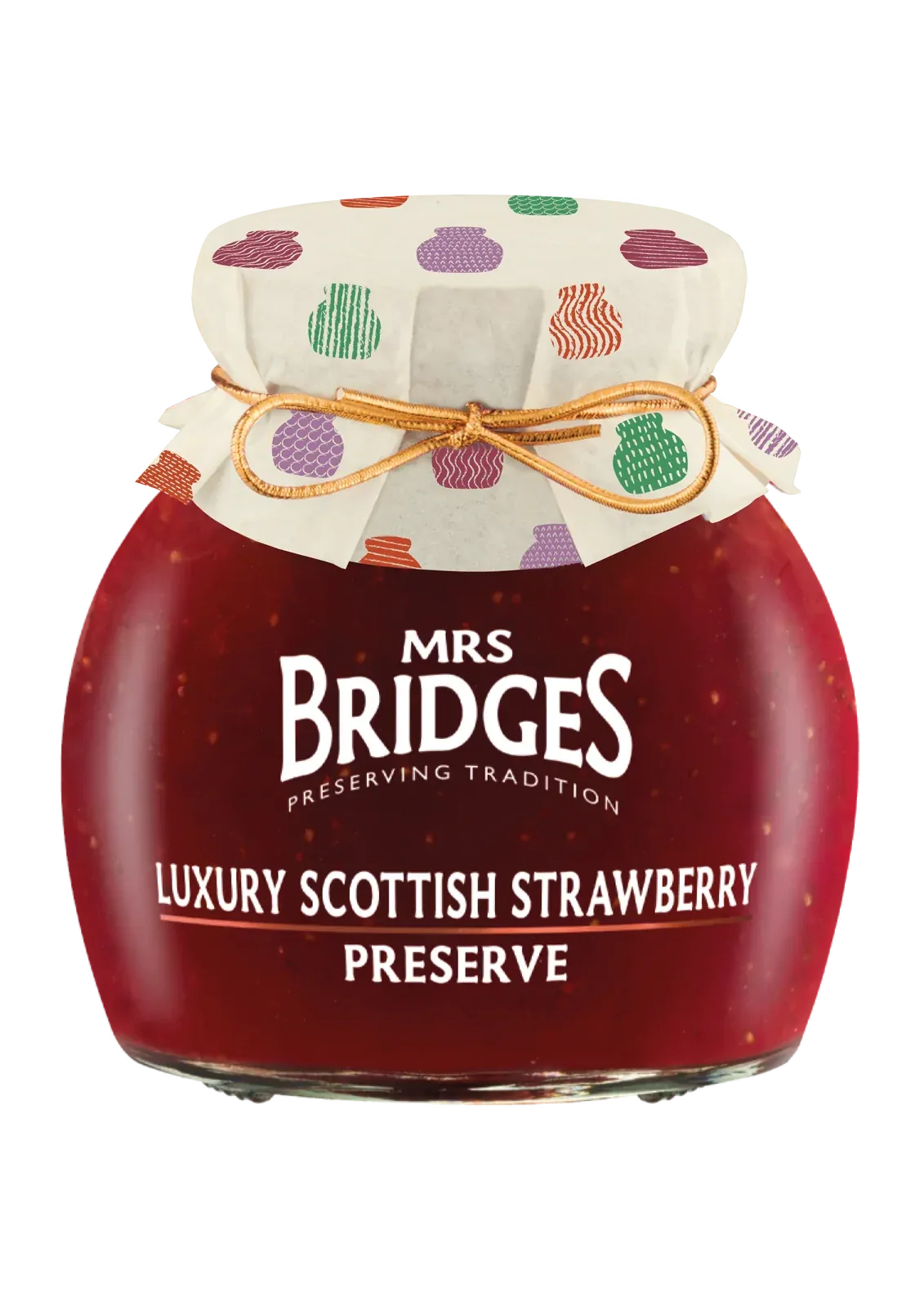 Mrs Bridges Luxury Scottish Strawberry Preserve is packed with whole ripe Scottish strawberries for a full, natural flavour. Crafted in copper pans using traditional methods, it reflects true Scottish indulgence.