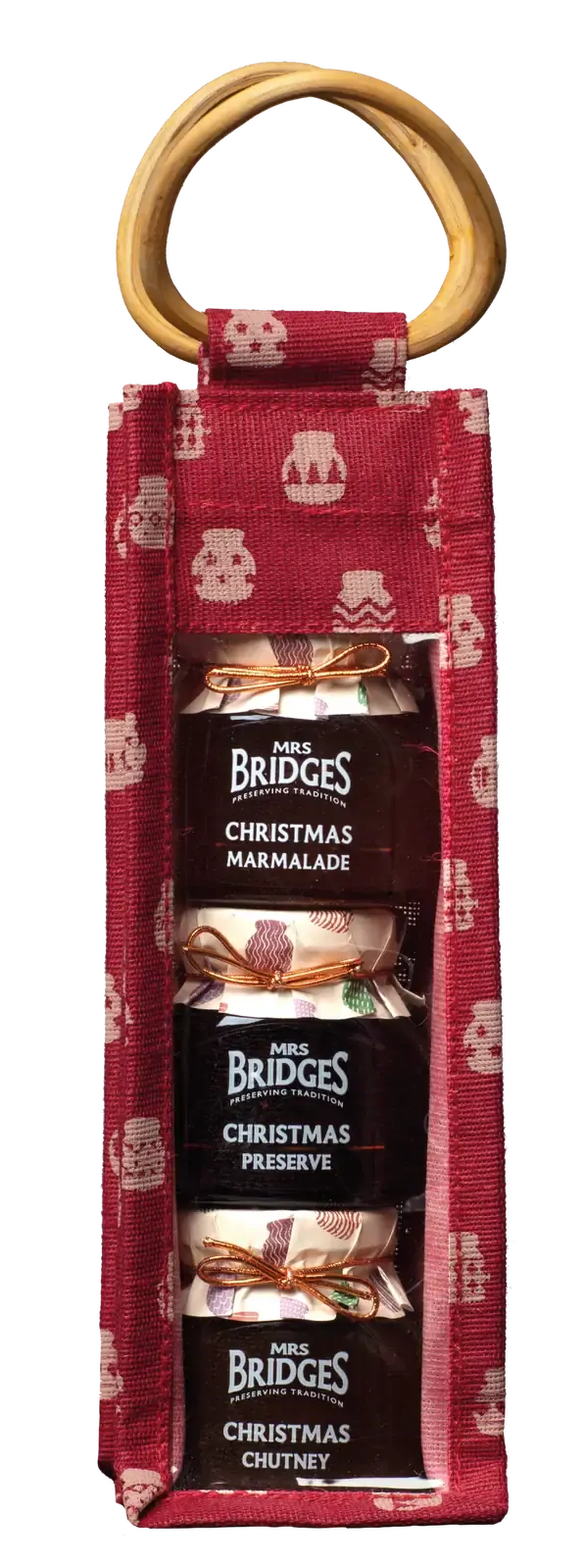 Mrs Bridges Triple Jar Juco Bag Indulgence (Red) contains three indulgent Scottish preserves presented in a festive red jute bag. A delicious gift choice for any occasion.